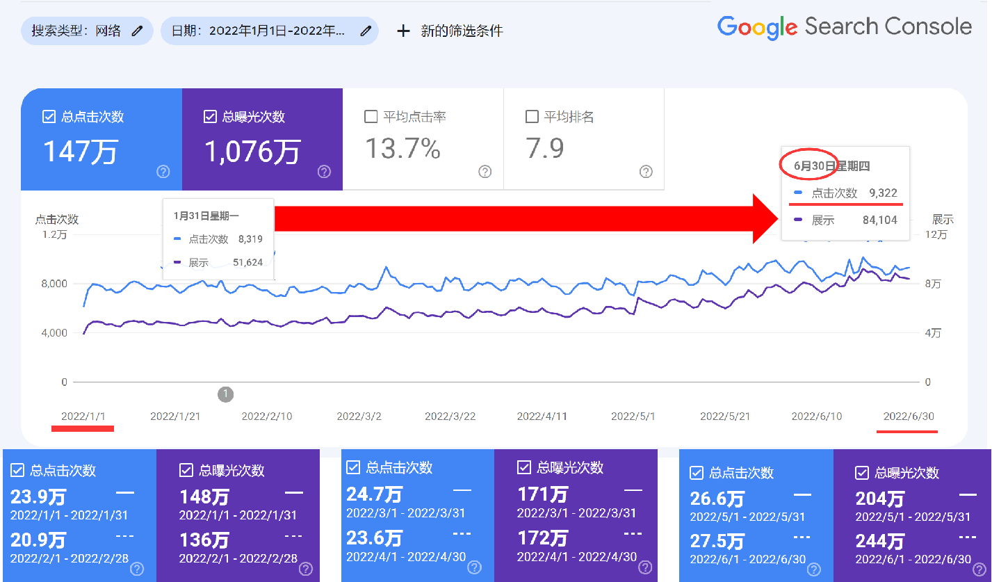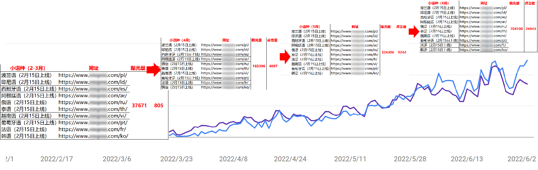 隨著新增關鍵詞超級頁面、小語種頁面、外鏈的不斷發布、積累和沉淀,谷歌的持續抓取收錄,網站曝光量與點擊量上漲趨勢和幅度越來越明顯;