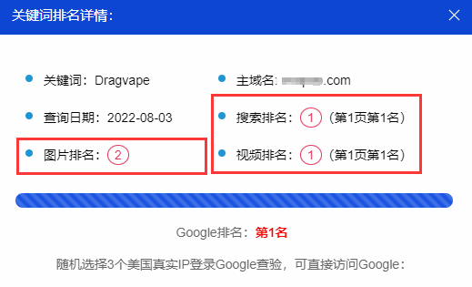 據最新數據顯示,網站關鍵詞排名首頁有391個,排在第一位有152個,除了關鍵詞,圖片和視頻優化在Google搜索引擎上也取得了排名靠前的理想的效果。